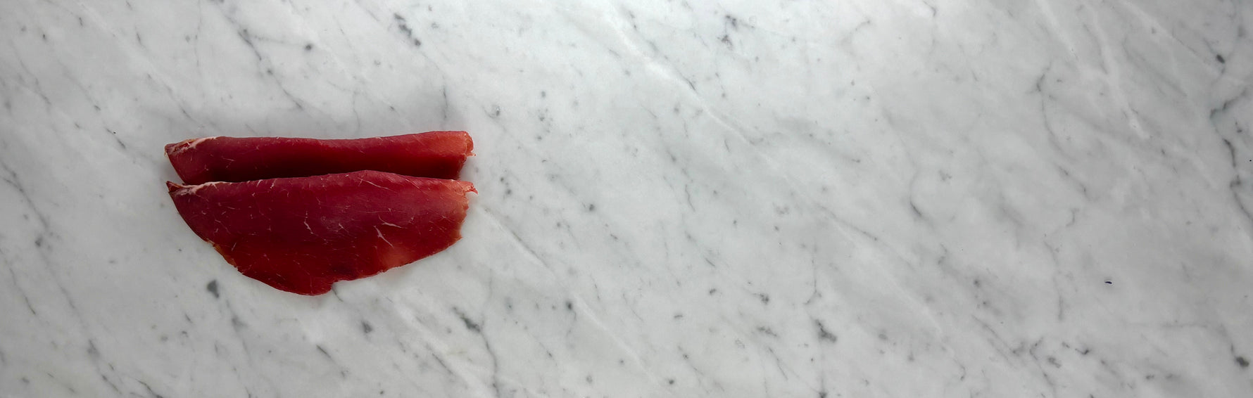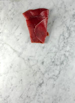 Eenheid prijs PerStaartstuk van het Piemontees, rund, het vlees is zeer fijn vet geaderd waardoor het erg mals is. De eerste 2 weken wordt het vlees in een mengsel van zout, rozemarijn, kaneel en kruidnagel gemarineerd en elke dag gemasseerd. Daarna 3 maanden lucht gedroogd.