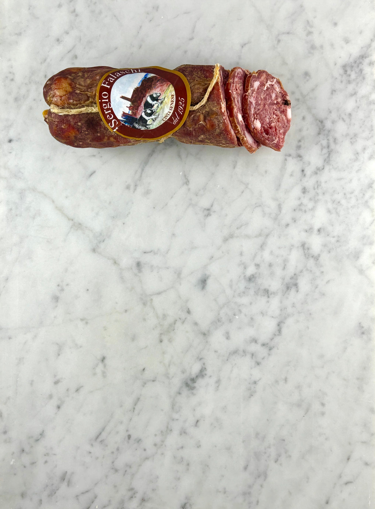Eenheid prijs PerDe Cinta Senese varkens – zwart van kleur met een witte baan om hun nek- lopen vrij rond in de bossen en weilanden. Kwaliteit beschermd door het Consorzio di Tutela della Cinta Senese. De salami is door het gebruikte vlees rijk van smaak. Toevoegingen: witte wijn, zout, peper en kruiden.