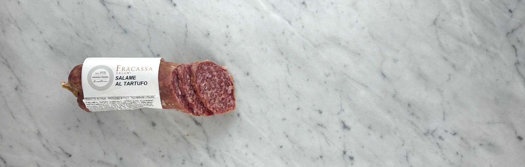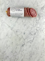 Eenheid prijs PerSalami -met daaraan toegevoegd 1% zwarte zomertruffel-schaafsel- Zonder toevoeging van artificiële truffelsmaak. Het vlees dat gebruikt wordt komt van varkens gefokt op hun eigen boerderij.